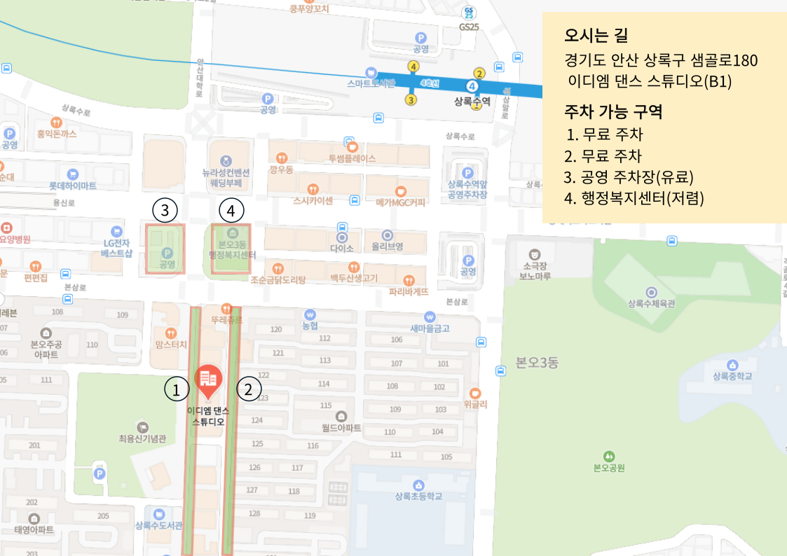 주소 : 경기도 안산시 상록구 샘골로180 이디엠댄스 스튜디오(B1)
